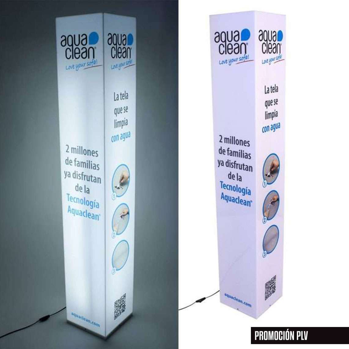 Tótem publicitario retroiluminado que combina funcionalidad y diseño impactante. Fabricado en metacrilato blanco de 3 mm con impresión en cuatricromía, cuenta con una estructura cuadrada de cartón de 25×25 cm y 150 cm de altura. En su interior, una tira de LED genera una luz difusa y suave que resalta el mensaje promocional, captando la atención en cualquier entorno comercial.